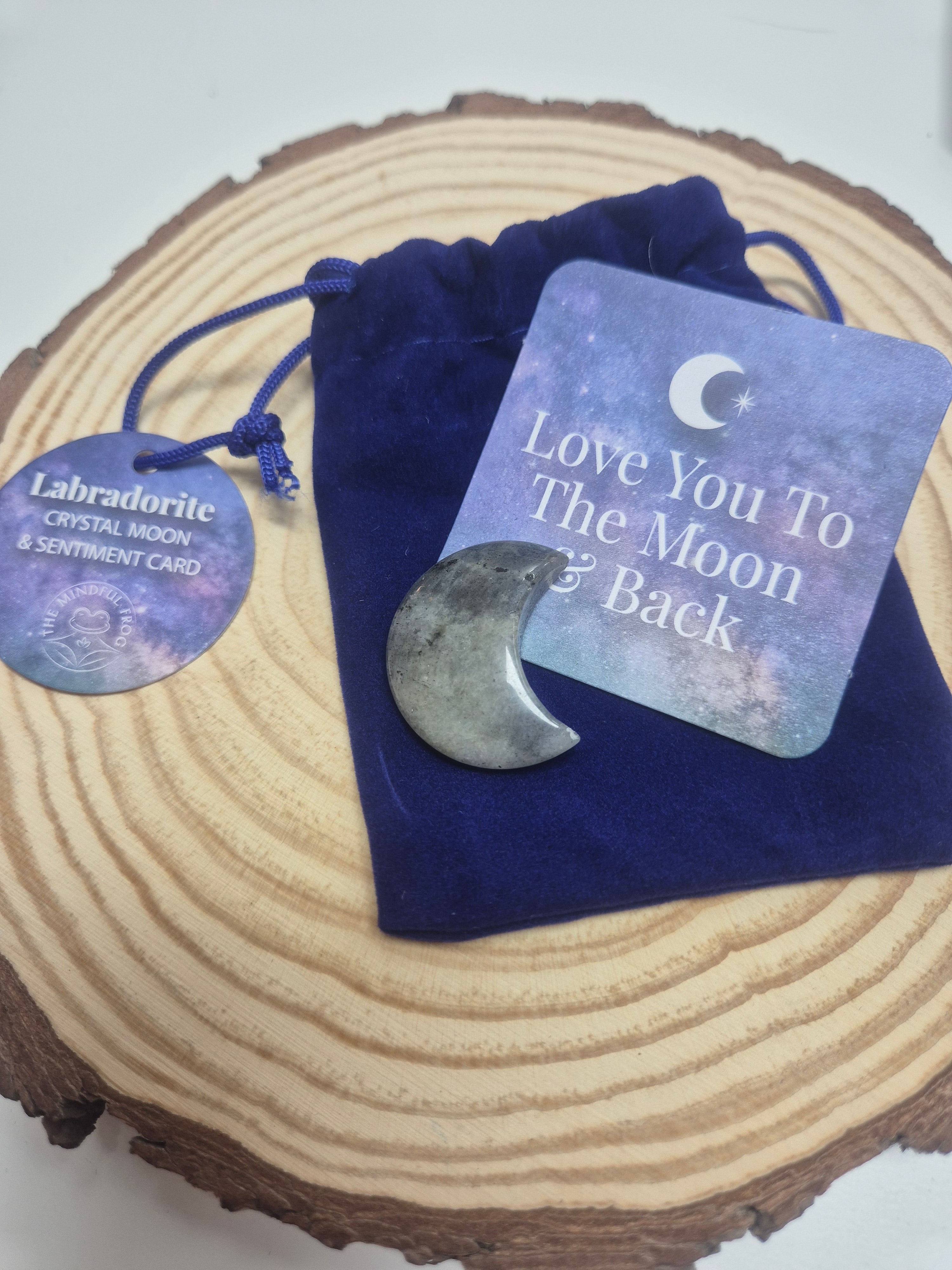 Amuleto Luna mineral de Labradorita – "Love You To The Moon & Back" Este encantador amuleto en forma de luna creciente, tallado en labradorita natural, viene...