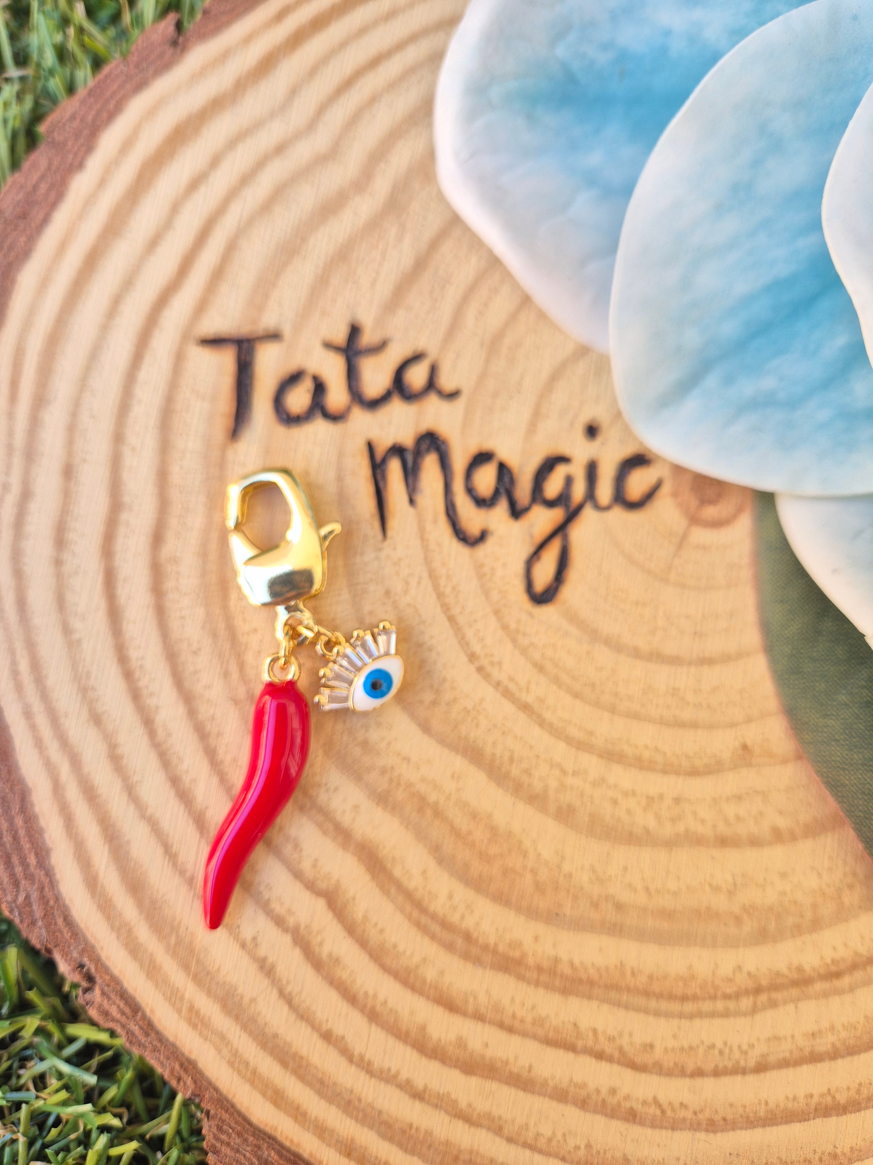 Colgante Cornicello con Ojo Turco en Cobre Consagrado para Bolso, Llavero - Amuleto contra Envidias