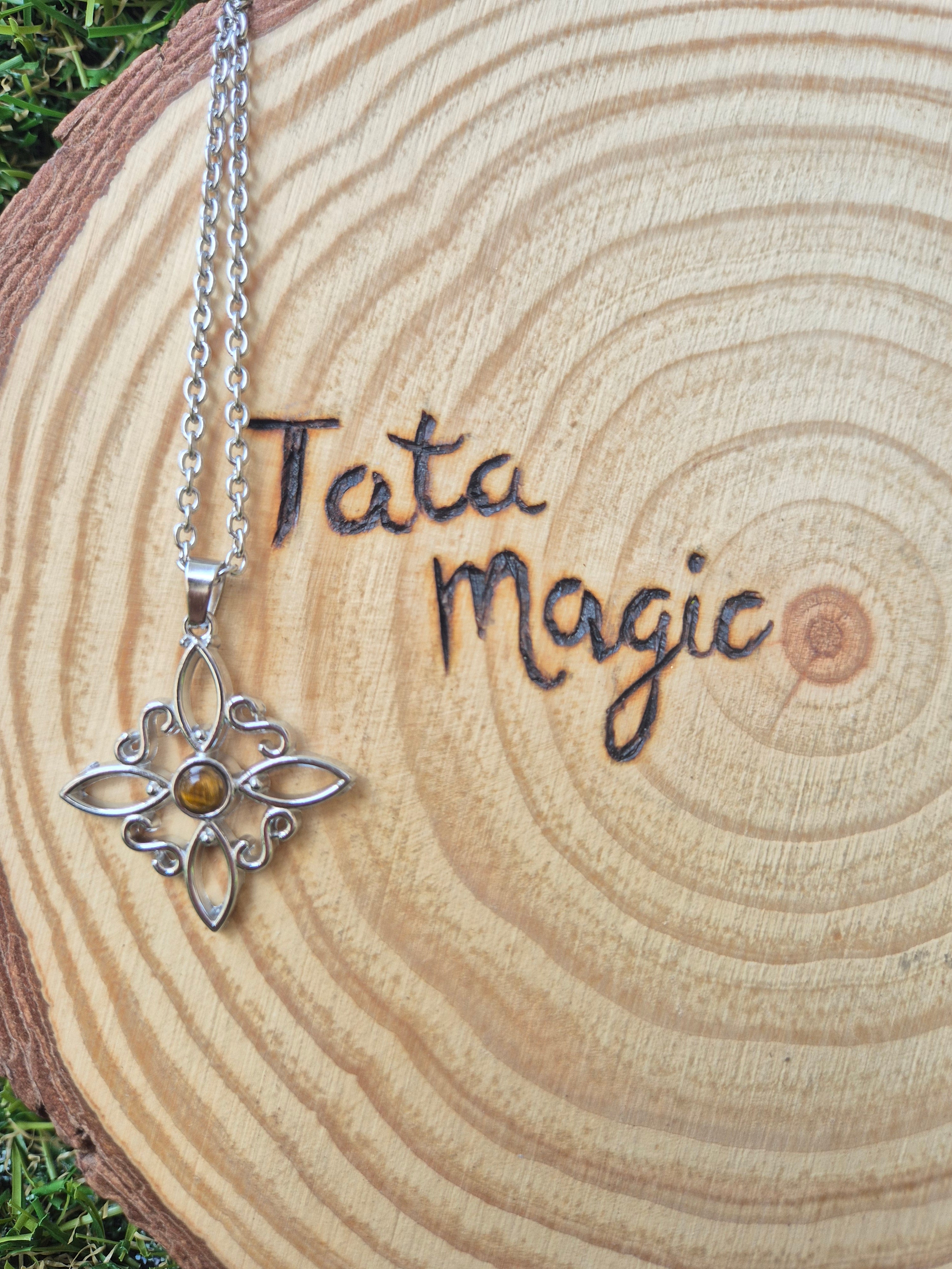 Colgante Nudo de Bruja con Ojo de Tigre en Acero Inoxidable - Protección y Energía