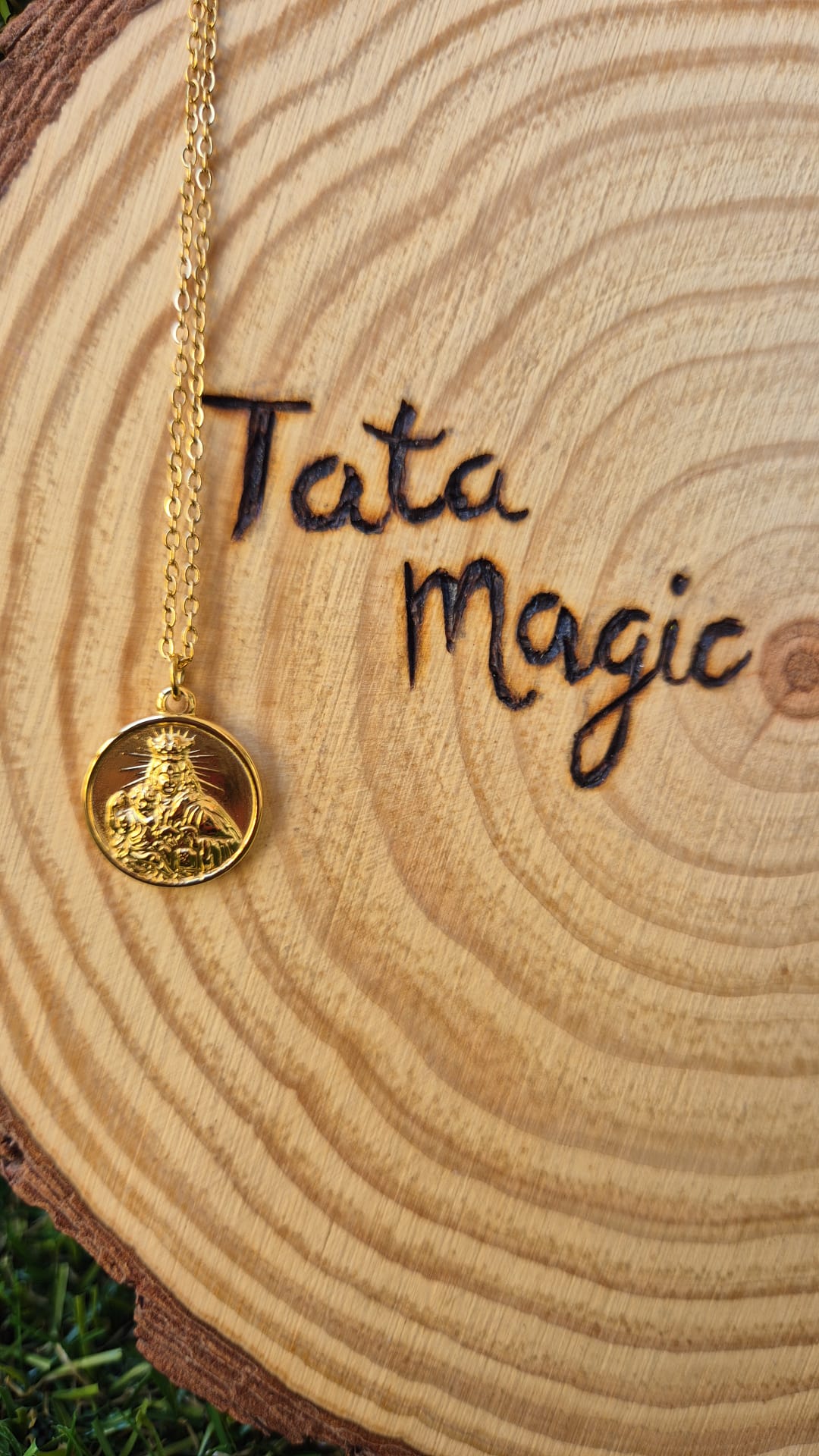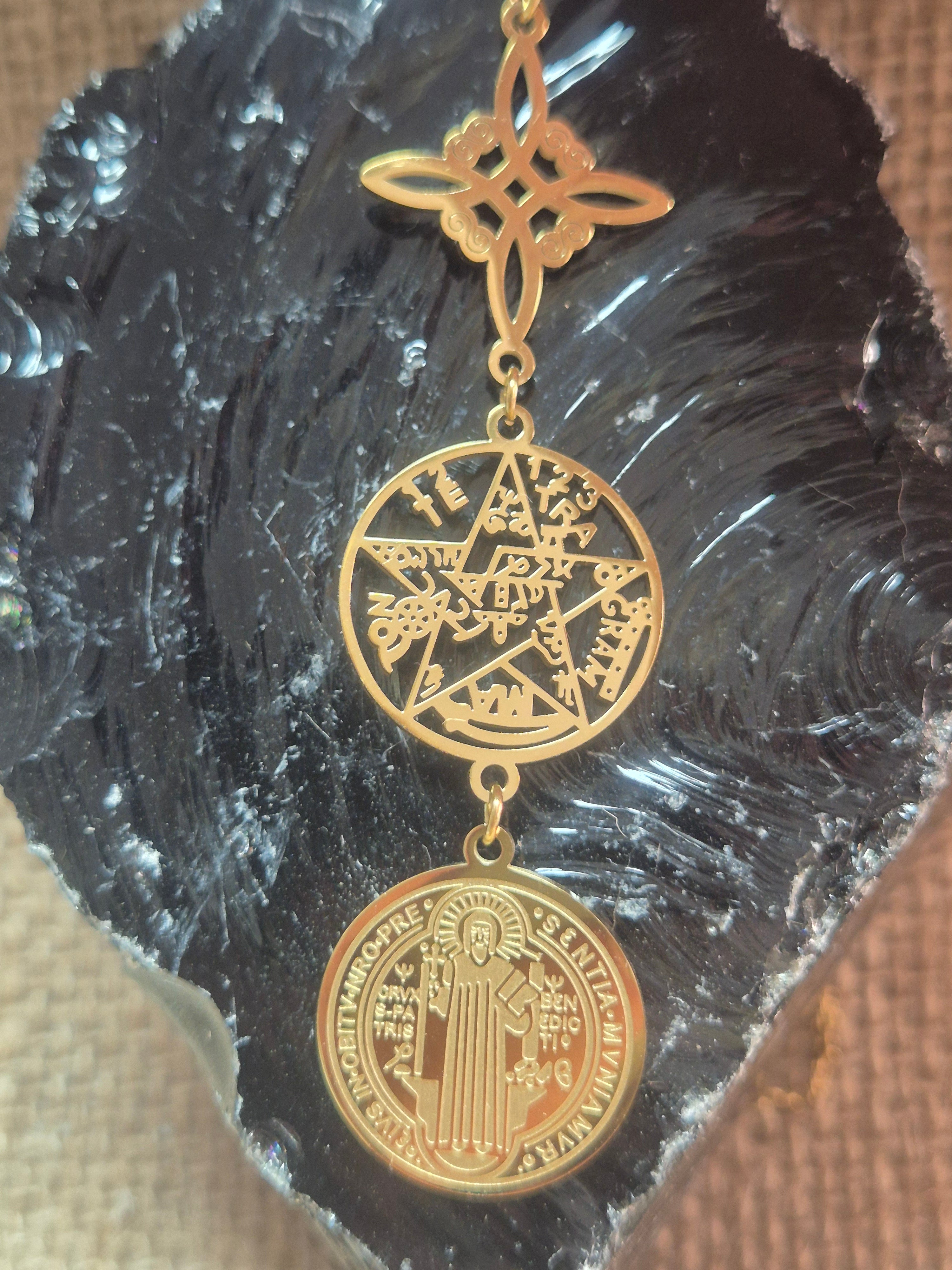 Colgante Triple Protección Acero Dorado Consagrado Este poderoso colgante de triple protección ha sido creado para actuar como un verdadero escudo espiritual, combinando símbolos sagrados y...