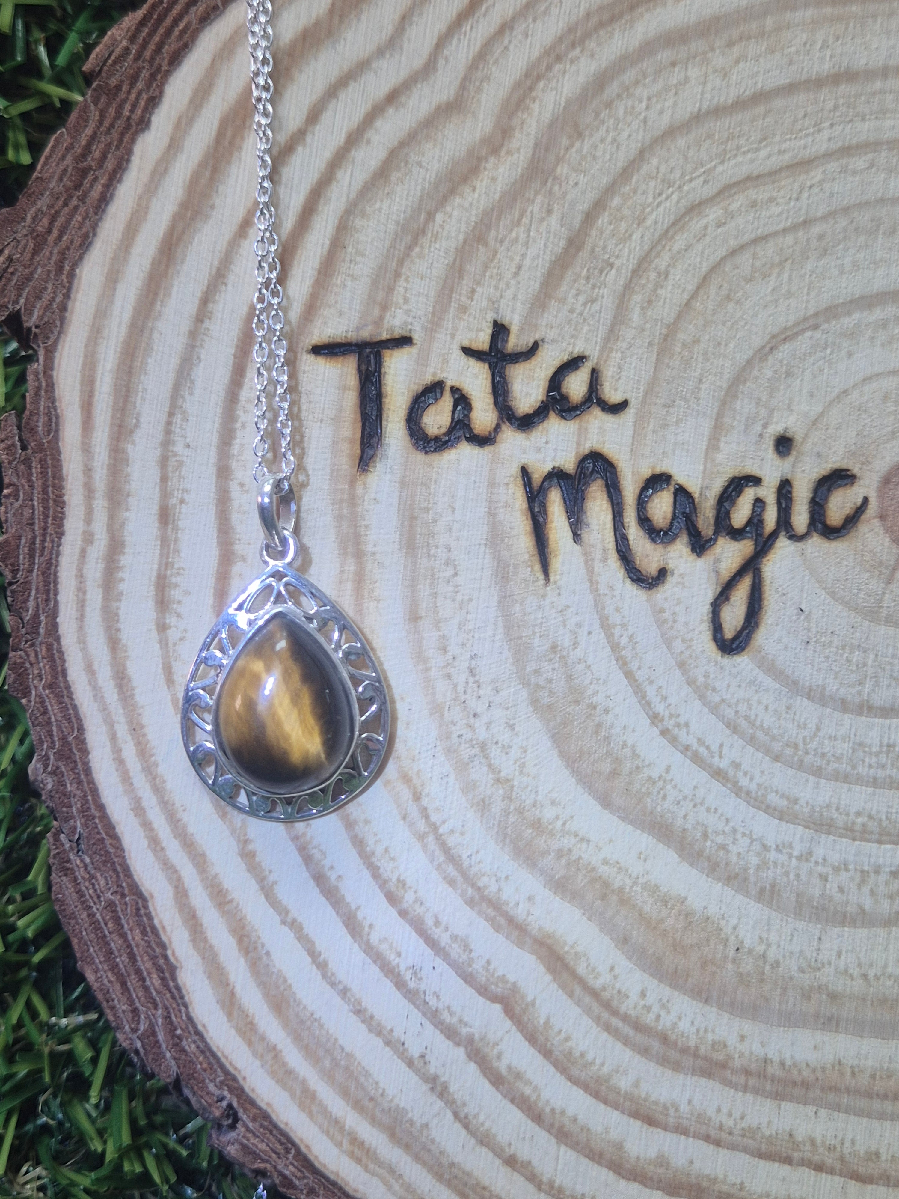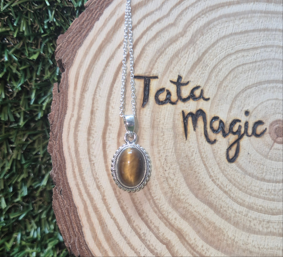 Colgante consagrado de Ojo de Tigre Lágrima en plata 925 con cadena- Protección energética, valor y empoderamiento