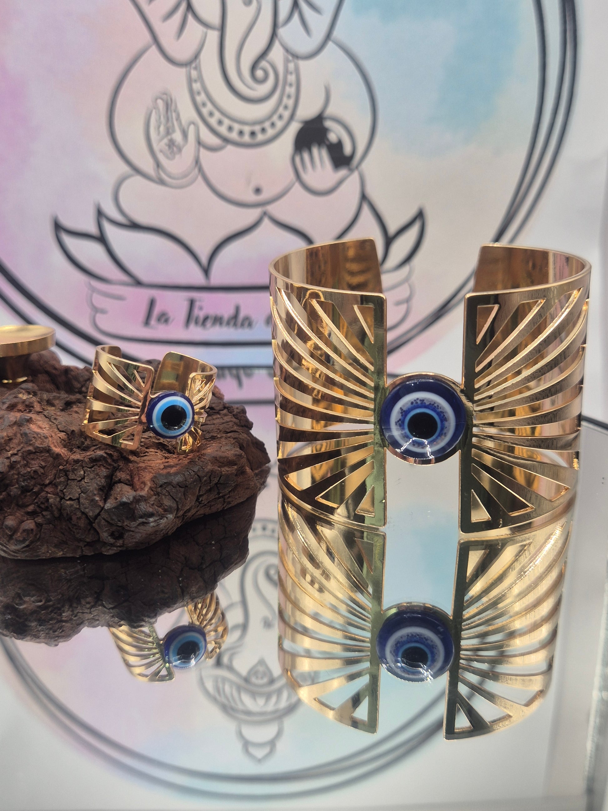 Brazalete Acero + Anillo Dorado Ojo Turco