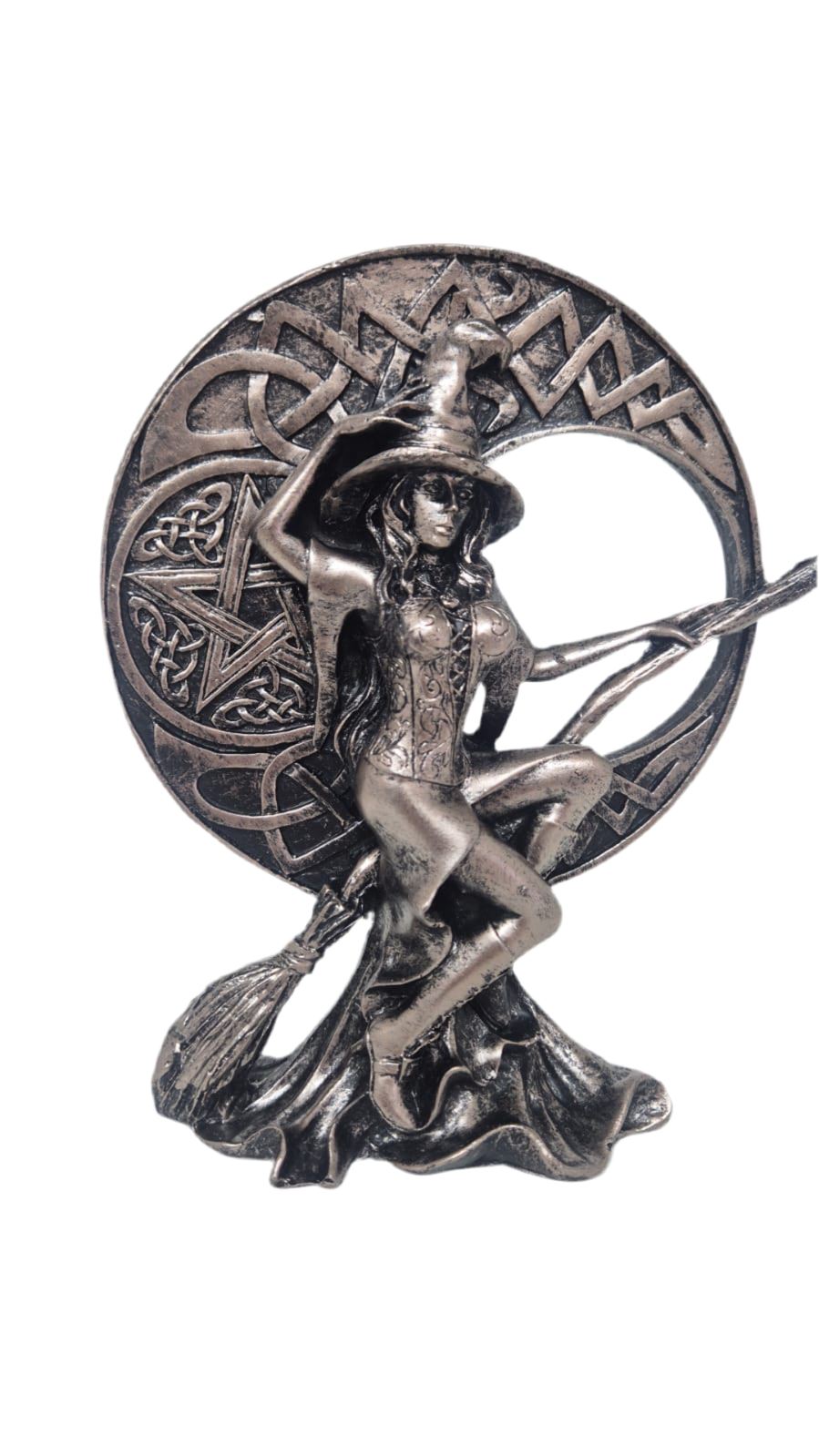 Es una figura que representa un bruja plateada sentada en la luna creciente. Esta figura irradia poder y sabiduría ancestral. Simboliza la conexión entre lo espiritual y lo oculto, representando intuición, protección y transformación. La luna creciente en su base indica nuevos comienzos y crecimiento espiritual.