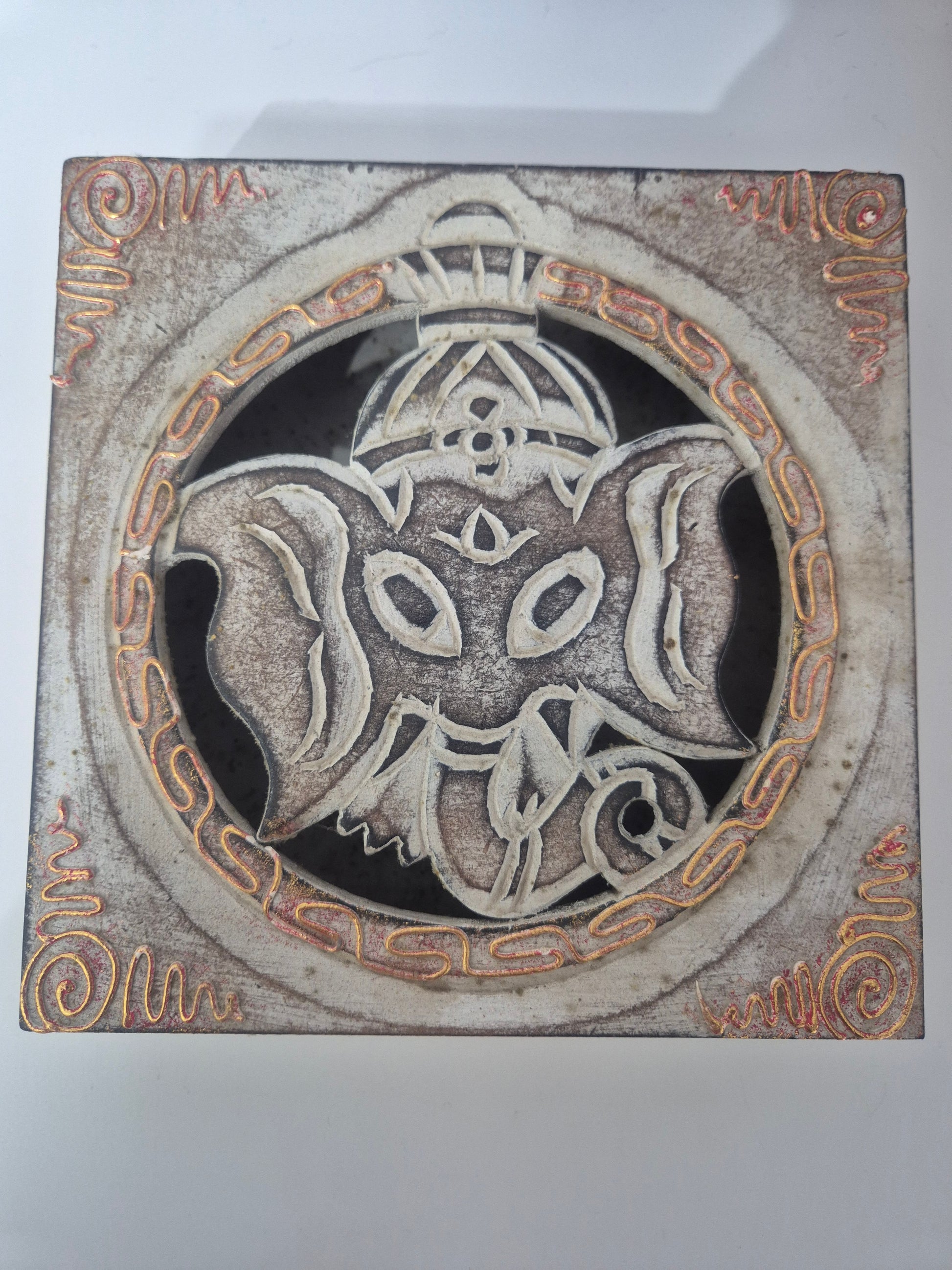 Caja Joyero Ganesha, hecha de madera pintada y tallada a mano con técnicas ancestrales.