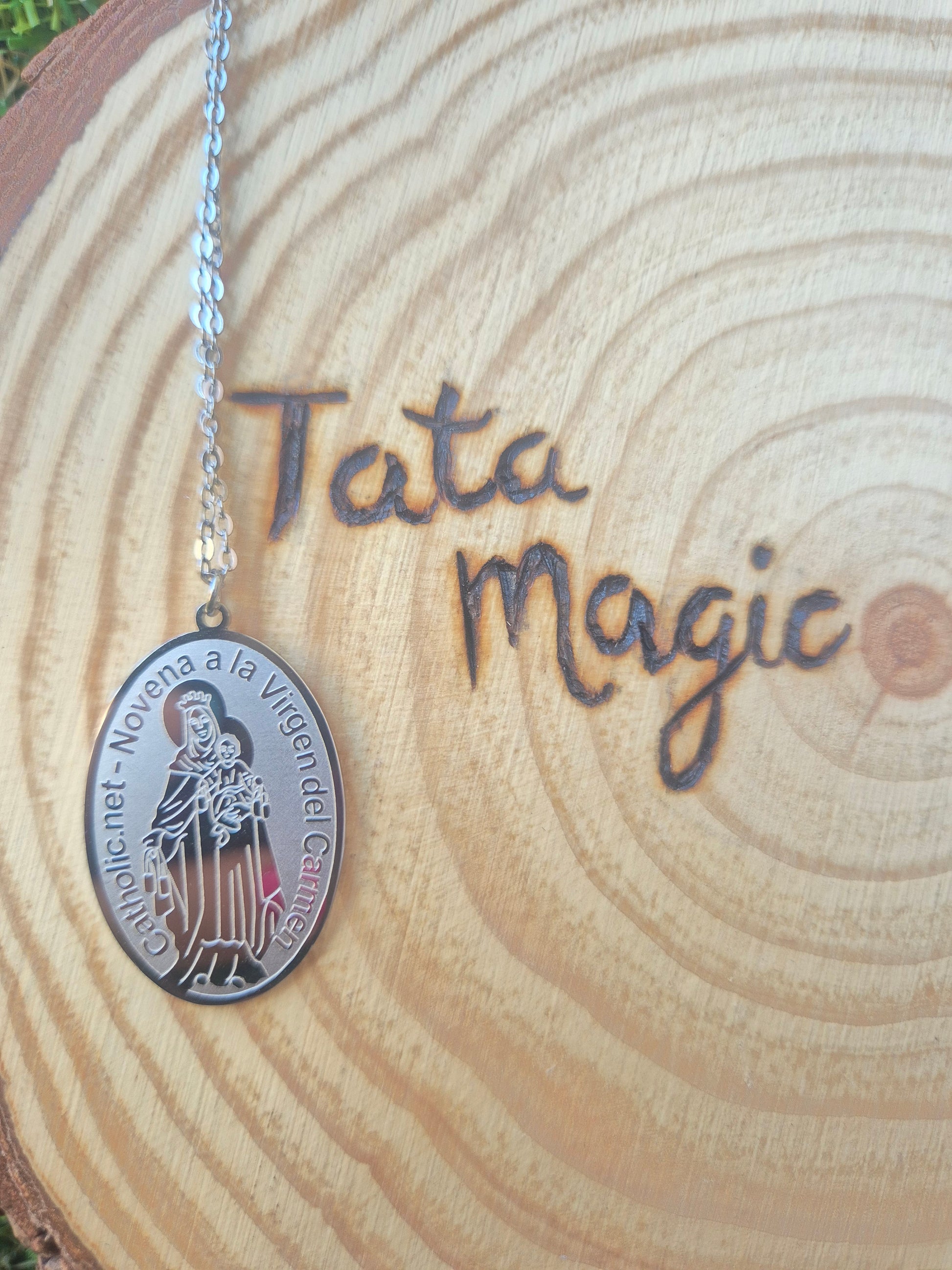 Este colgante de acero plateado es perfecto para aquellos que buscan mostrar su devoción a la Virgen del Carmen además de protección ante los peligros del cuerpo y alma librando a su portador de todo mal.