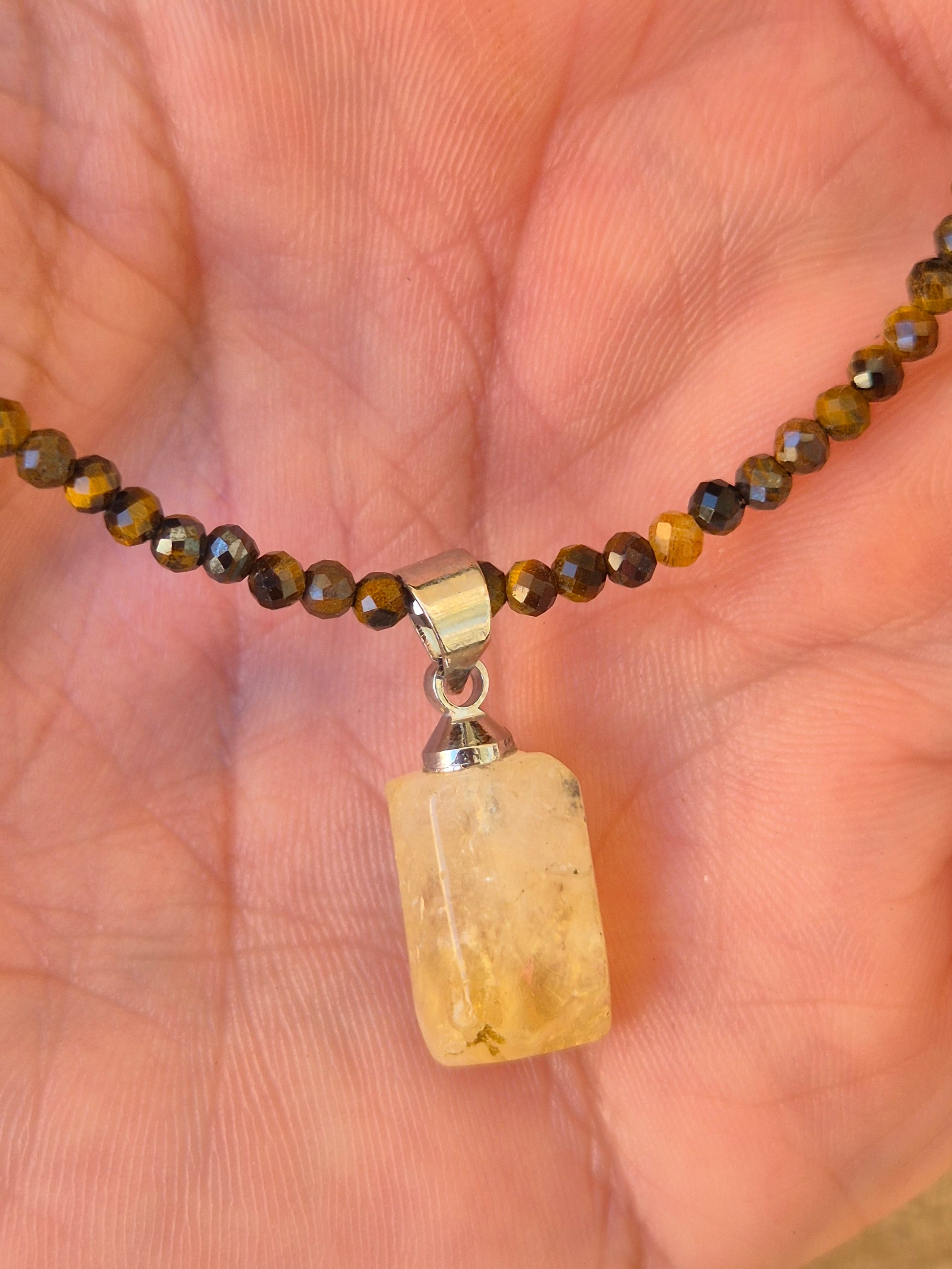 El Collar de Ojo de Tigre con Citrino es un poderoso talismán de protección, prosperidad y empoderamiento personal.