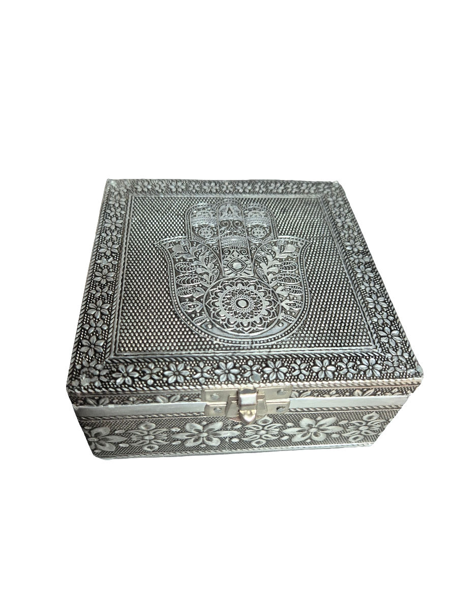Cuando necesites guardar tus joyas mas preciadas, tus amuletos o minerales mas cuidados...hazlo en esta caja de la Mano de Fátima y deja que la energía de su protección los recargue.